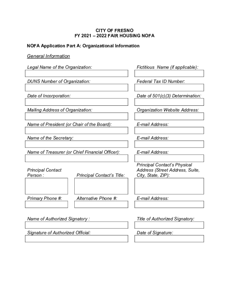 CITY OF FRESNO FY 2021 2022 FAIR HOUSING NOVA Application Part A: Organizational InformationGeneral Information Legal Name of the Organization:Fictitious Name (if applicable):DUNS Number of Organization:Federal