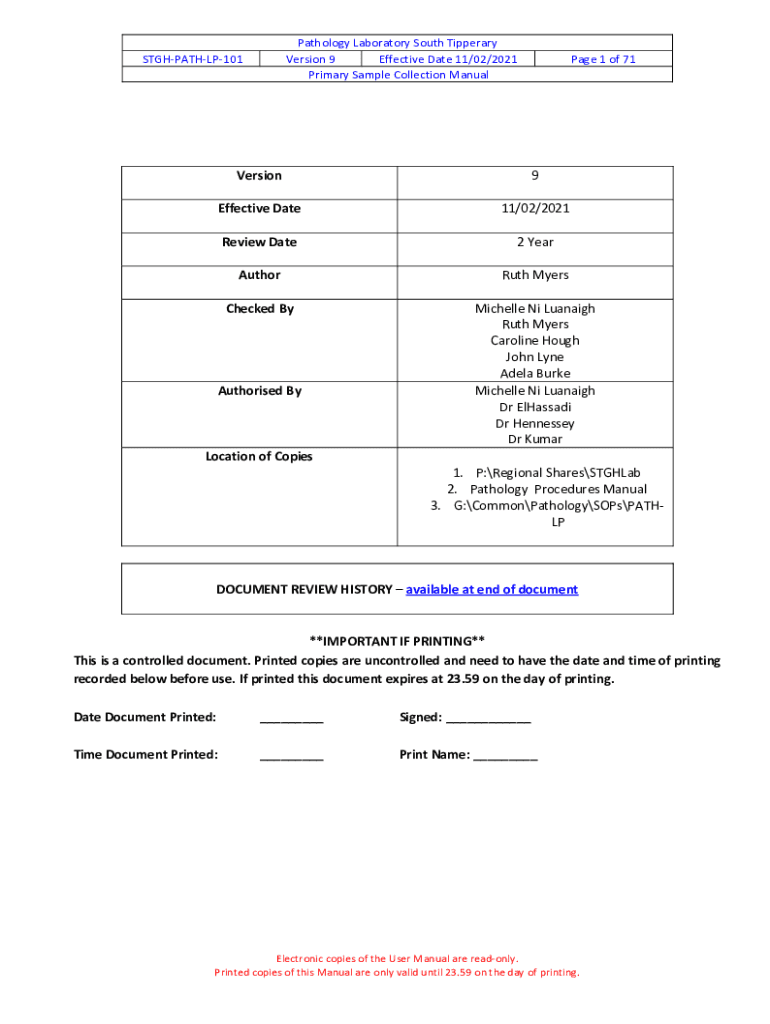 Pathology Laboratory South Tipperary Version 9 Effective Date 11/02/2021 Primary Sample Collection ManualSTGHPATHLP101Page 1 of 71Version9Effective Date11/02/2021Review Date2 YearAuthorRuth MyersChecked