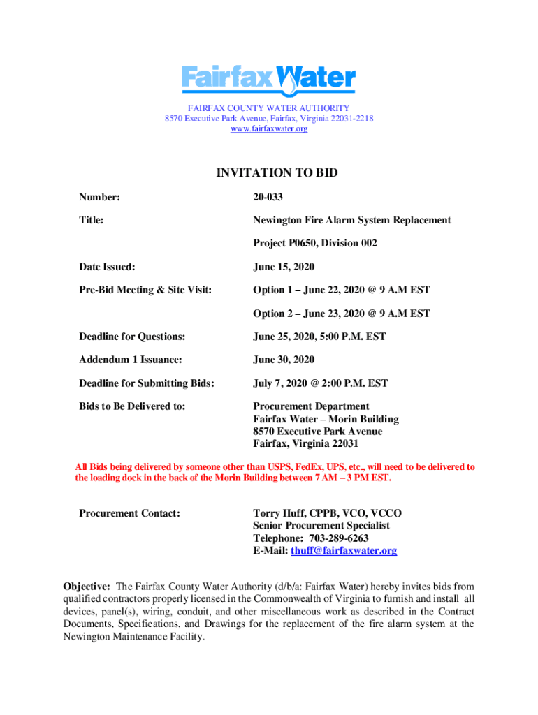 FAIRFAX COUNTY WATER AUTHORITY 8570 Executive Park Avenue, Fairfax, Virginia 220312218 www.fairfaxwater.orgINVITATION TO BID Number:20033Title:Newington Fire Alarm System Replacement Project P0650,