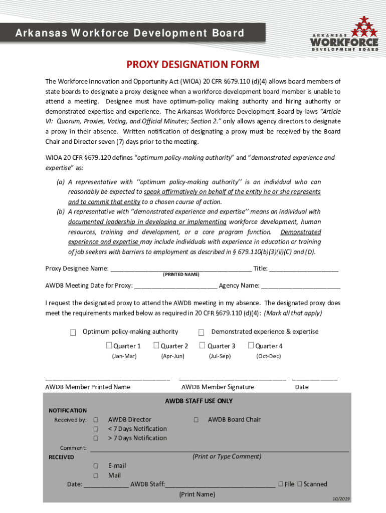 Arkansas Workforce Development Boardroom DESIGNATION From The Workforce Innovation and Opportunity Act (WHOA) 20 CFR 679.110 (d)(4) allows board members of state boards to designate a proxy designee