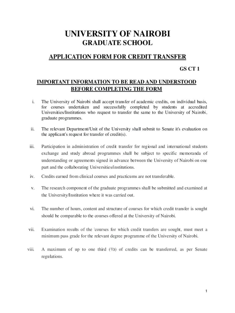 UNIVERSITY OF NAIROBI GRADUATE SCHOOL APPLICATION FORM FOR CREDIT TRANSFER GS CT 1 IMPORTANT INFORMATION TO BE READ AND UNDERSTOOD BEFORE COMPLETING THE FORM i. The University of Nairobi shall accept