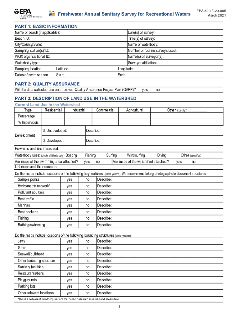 Freshwater Annual Sanitary Survey for Recreational Waters PART 1: BASIC INFORMATION Name of beach (if applicable): Beach ID: City/County/State: Sampling station(s)/ID: WAX organizational ID: Water