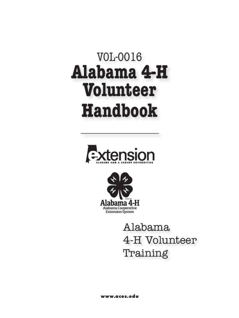 VOL0016Alabama 4H Volunteer Handbook Alabama 4H Volunteer Training.aces.editable of Contents Welcome to Alabama 4H!................................................................. 3 The 4H Pledge................................................................................