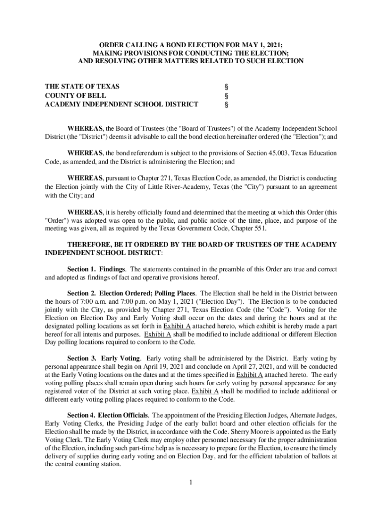 ORDER CALLING A BOND ELECTION FOR MAY 1, 2021; MAKING PROVISIONS FOR CONDUCTING THE ELECTION; AND RESOLVING OTHER MATTERS RELATED TO SUCH ELECTION THE STATE OF TEXAS COUNTY OF BELL ACADEMY INDEPENDENT