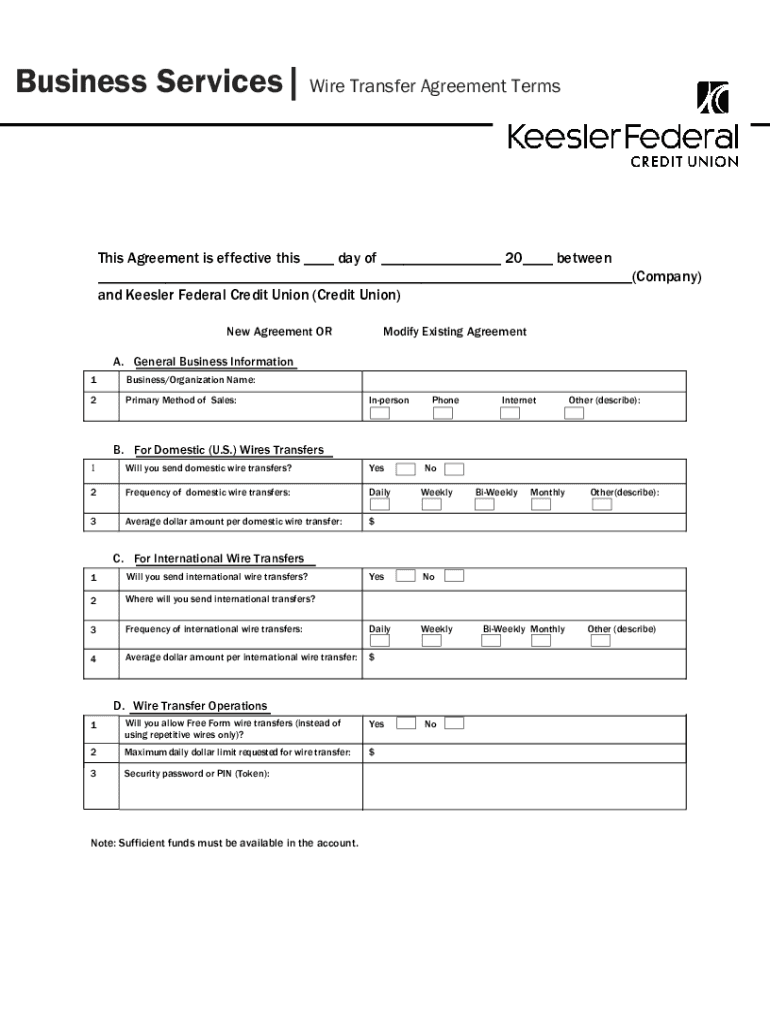 Business Services Wire Transfer Agreement Termites Agreement is effective this day of 20 between (Company) and Kessler Federal Credit Union (Credit Union) New Agreement Modify Existing Agreement.