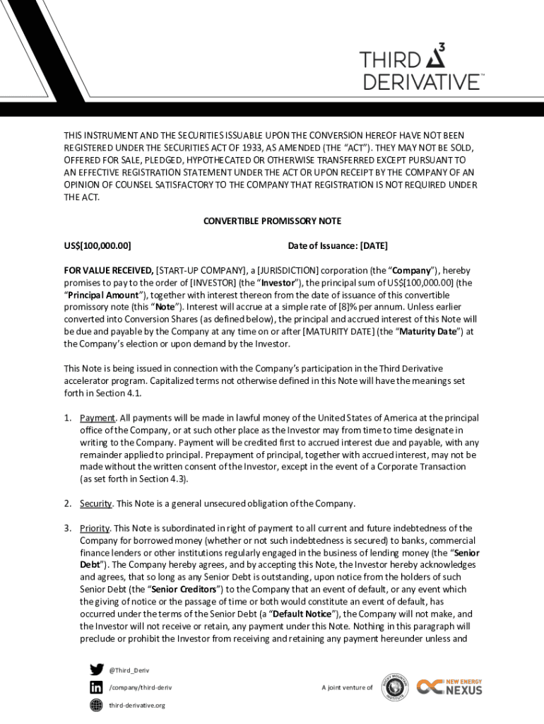 A convertible promissory note is a type of debt instrument that can be converted into equity in the company issuing the note, typically at a discount to the price per share in the company's next round of financing.