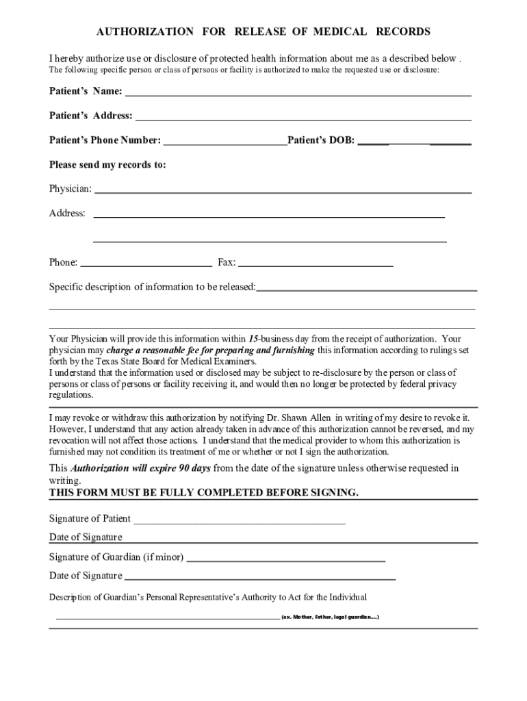 AUTHORIZATION FOR RELEASE OF MEDICAL RECORDS I hereby authorize use or disclosure of protected health information about me as a described below. The following specific person or class of persons or