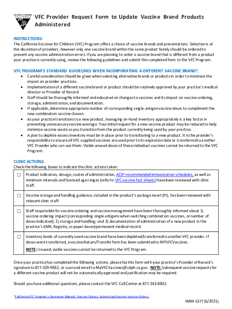 Get the free IMM-1377 VFC Provider Request Form to Update Vaccine Brand Products Administered