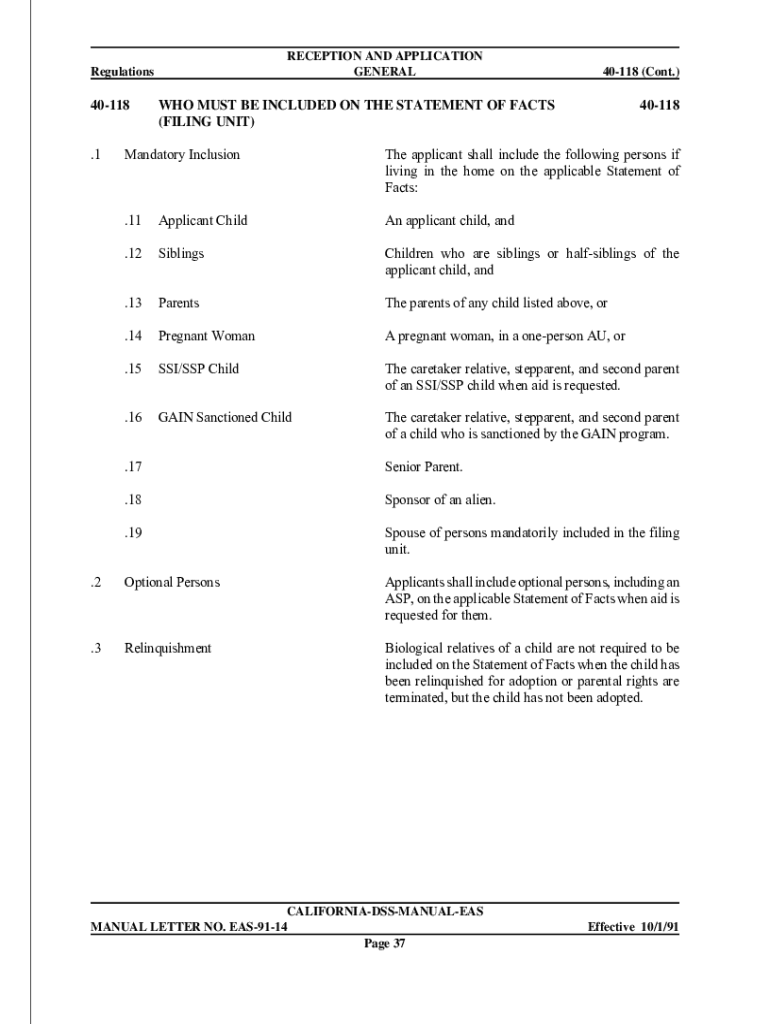 RECEPTION AND APPLICATION GENERALRegulations40118 .140118 (Cont.)WHO MUST BE INCLUDED ON THE STATEMENT OF FACTS (FILING UNIT)40118Mandatory Inclusion applicant shall include the following persons