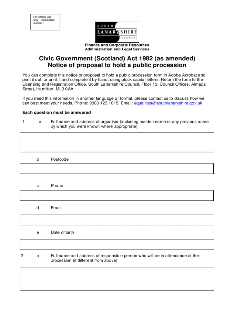 For official use only notification number:Finance and Corporate Resources Administration and Legal ServicesCivic Government (Scotland) Act 1982 (as amended) Notice of proposal to hold a public procession