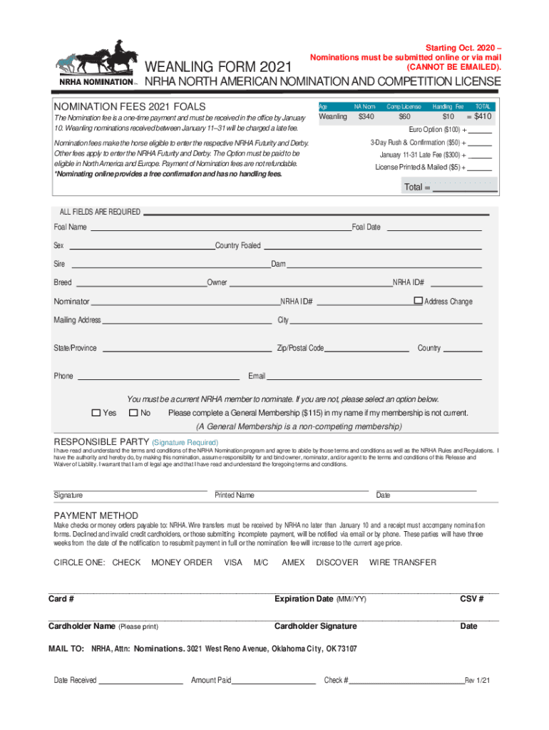 WEANING FORM 2021Starting Oct. 2020 Nominations must be submitted online or via mail (CANNOT BE EMAILED).NRA NORTH AMERICAN NOMINATION AND COMPETITION LICENSE NOMINATION FEES 2021 FOALSAgeThe Nomination