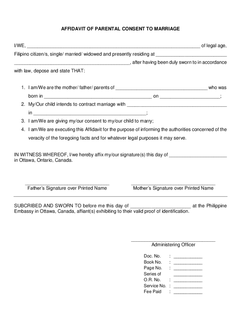 AFFIDAVIT OF PARENTAL CONSENT TO MARRIAGE/WE, of legal age, Filipino citizen/s, single/ married/ widowed and presently residing at, after having been duly sworn to in accordance with law, depose and