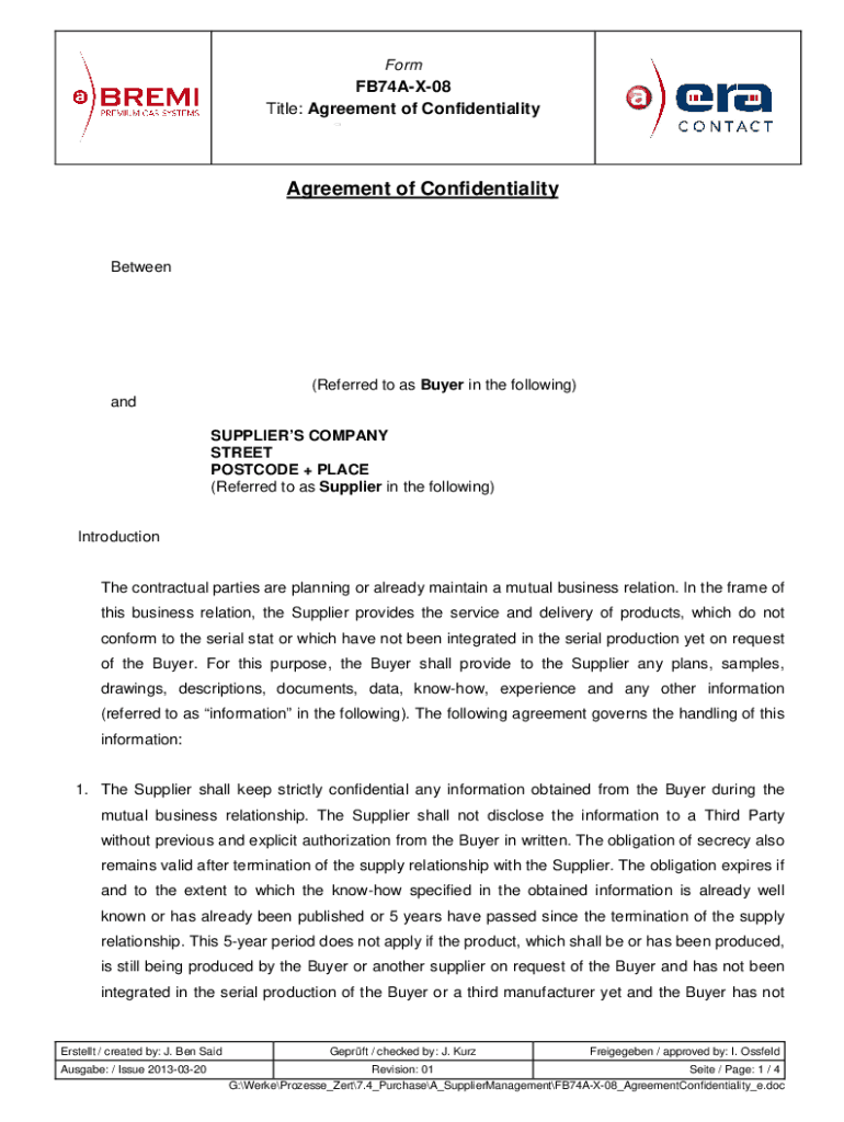 FormFB74AX08 Title: Agreement of ConfidentialityAgreement of ConfidentialityBetween(Referred to as Buyer in the following) and SUPPLIERS COMPANY STREET POSTCODE + PLACE (Referred to as Supplier in
