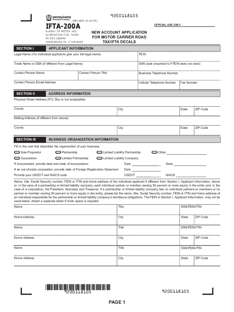 9200118105 (Mph) Mod 1018 (phi)IFTA200ABureau of Motor and alternative fuel Taxes Po Box 280646 Harrisburg Pa 171280646SECTION OFFICIAL USE ONLINE ACCOUNT APPLICATION FOR MOTOR CARRIER ROAD TAX/IFTA