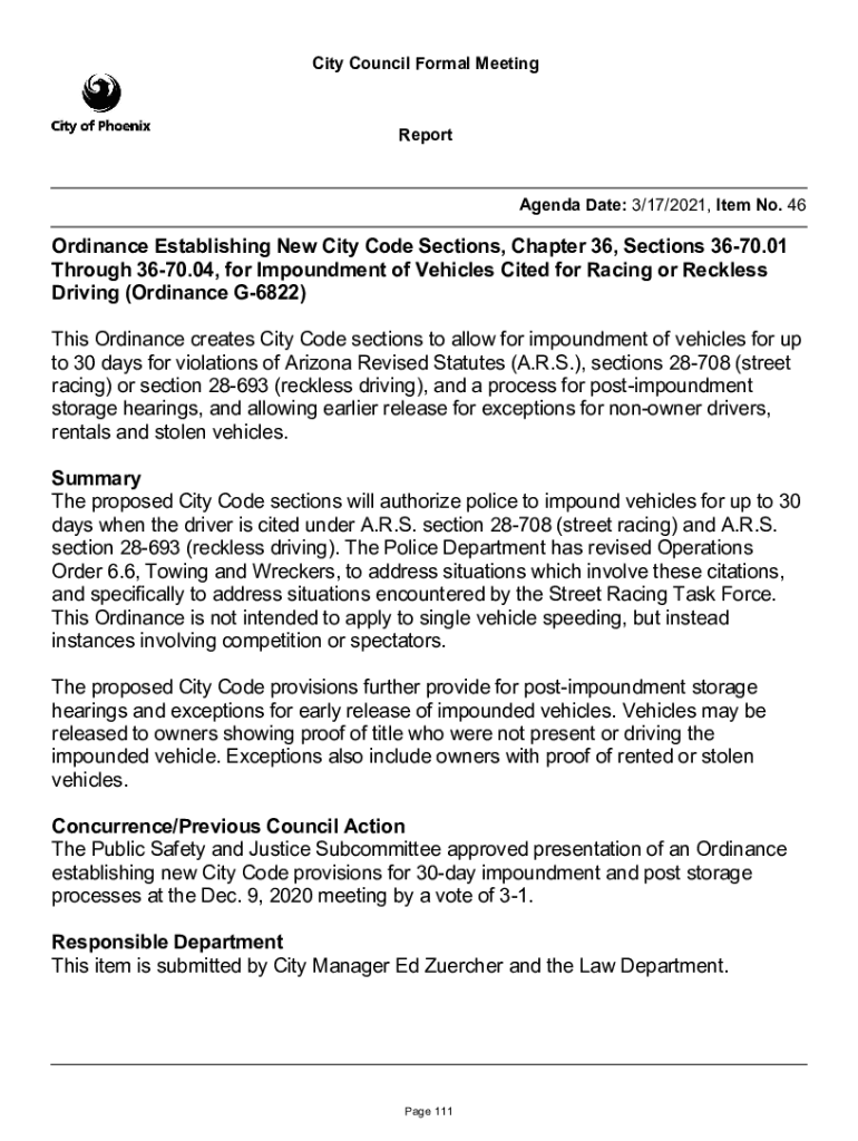 City Council Formal MeetingReportAgenda Date: 3/17/2021, Item No. 46Ordinance Establishing New City Code Sections, Chapter 36, Sections 3670.01 Through 3670.04, for Impoundment of Vehicles Cited for