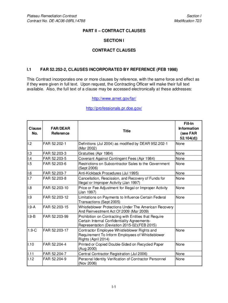 Plateau Remediation Contract No. DEAC0608RL14788Section I Modification 723PART II CONTRACT CLAUSES SECTION I CONTRACT CLAUSES.1FAR 52.2522, CLAUSES INCORPORATED BY REFERENCE (FEB 1998)This Contract