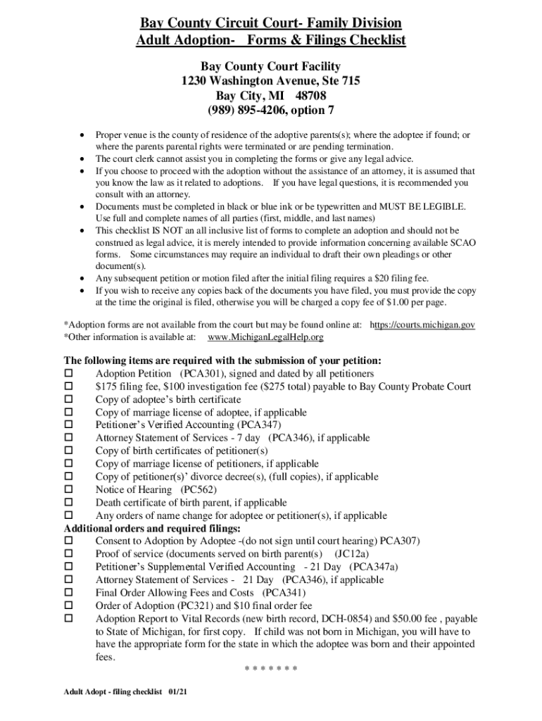 Bay County Circuit Court Family Division Adult Adoption Forms & Filings Checklist Bay County Court Facility 1230 Washington Avenue, Ste 715 Bay City, MI 48708 (989) 8954206, option 7 Proper venue