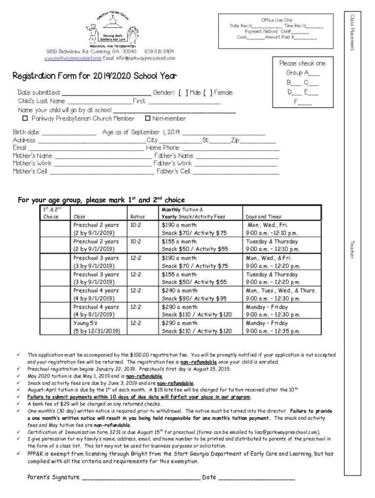 5830 Bethelview Rd. Cumming, GA 30040 6785133909 www.parkwaypreschool.com Email: info parkway preschool. Registration Form for 2019/2020 School Year Date submitted: Gender: Male Female Child's Last
