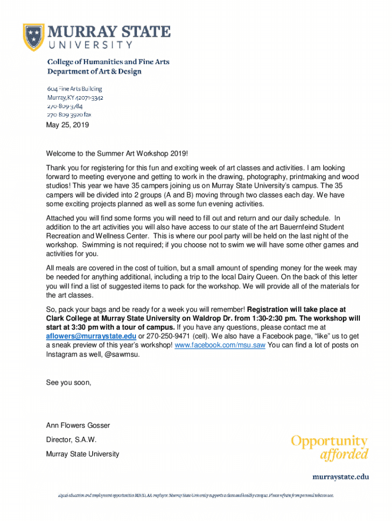 May 25, 2019Welcome to the Summer Art Workshop 2019! Thank you for registering for this fun and exciting week of art classes and activities. I am looking forward to meeting everyone and getting to