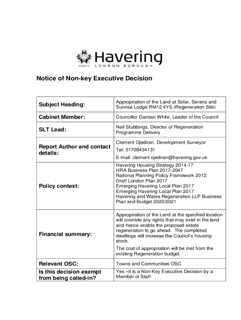 Notice of Monkey Executive DecisionSubject Heading:Appropriation of the Land at Solar, Serena and Sunrise Lodge RM12 4YS (Regeneration Site)Cabinet Member:Councillor Damian White, Leader of the Council
