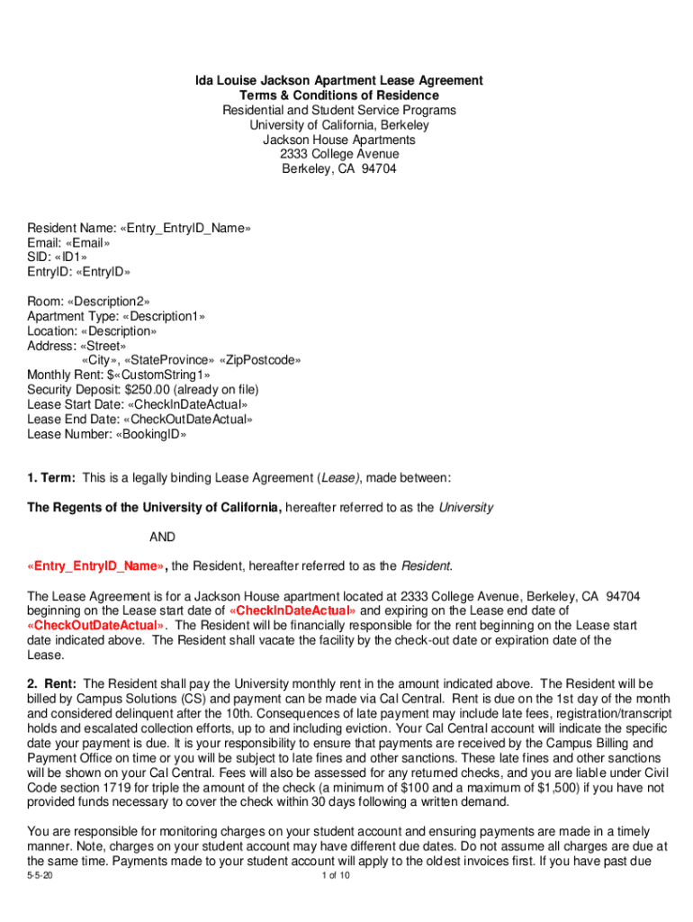 Ida Louise Jackson Apartment Lease Agreement Terms & Conditions of Residence Residential and Student Service Programs University of California, Berkeley Jackson House Apartments 2333 College Avenue