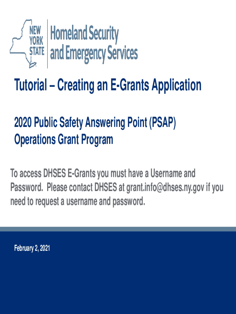 Tutorial Creating a Grants Application 2020 Public Safety Answering Point (PSA) Operations Grant Program To access DOSES Grants you must have a Username and Password. Please contact DOSES at grant.info@dhses.ny.gov