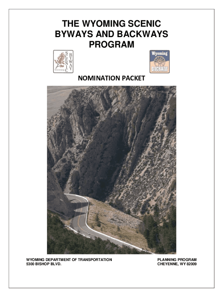 THE WYOMING SCENIC BYWAYS AND BACKWARDS PROGRAMNOMINATION PACKETWYOMING DEPARTMENT OF TRANSPORTATION 5300 BISHOP BLVD.PLANNING PROGRAM CHEYENNE, WY 82009CONTENTSINTRODUCTION2GENERAL INSTRUCTIONS3NOMINATION