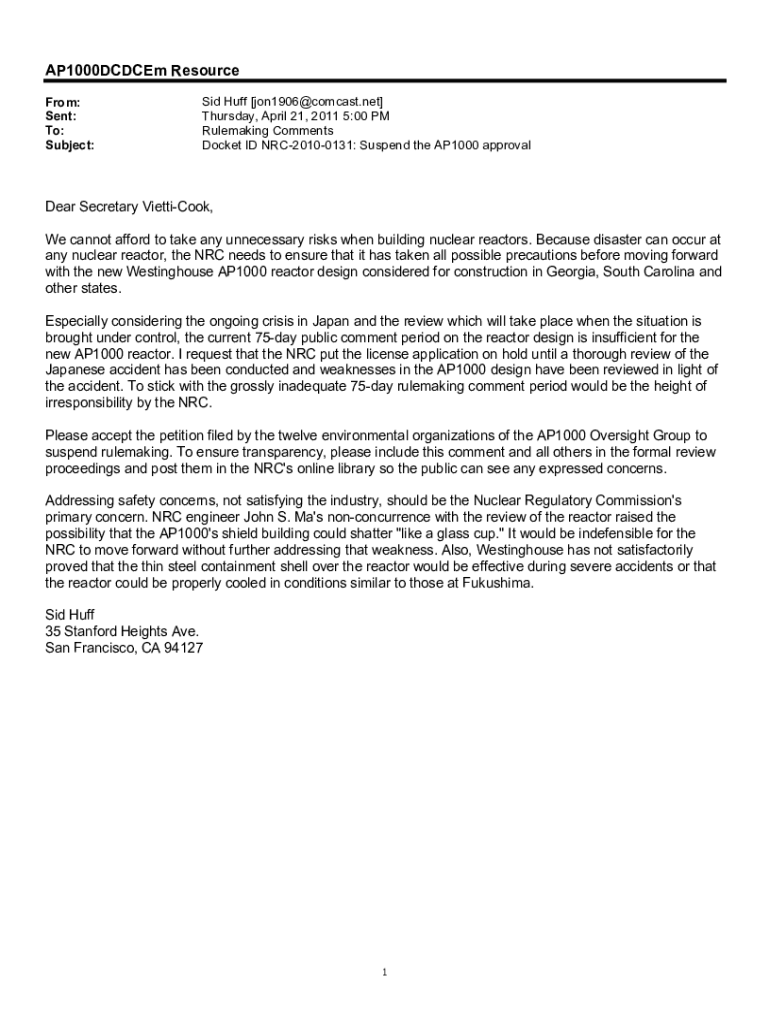 AP1000DCDCEm Resource From: Sent: To: Subject:Sid Huff jon1906 Comcast.net Thursday, April 21, 2011 5:00 PM Rule making Comments Docket ID NRC20100131: Suspend the AP1000 approvalDear Secretary ViettiCook,
