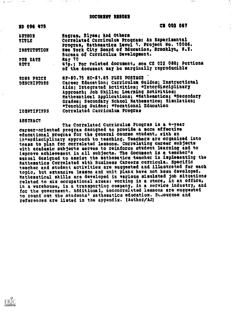 MUN DT MOND CO 002 067OD 096 475 AUTHOR TITLEINSTITUTION PUB DATE NOTE!DRS PRICE DESCRIPTORSIDENTIFIERSNegras, Else; And Others Correlated Curriculum Program; An Experimental Program, Mathematics