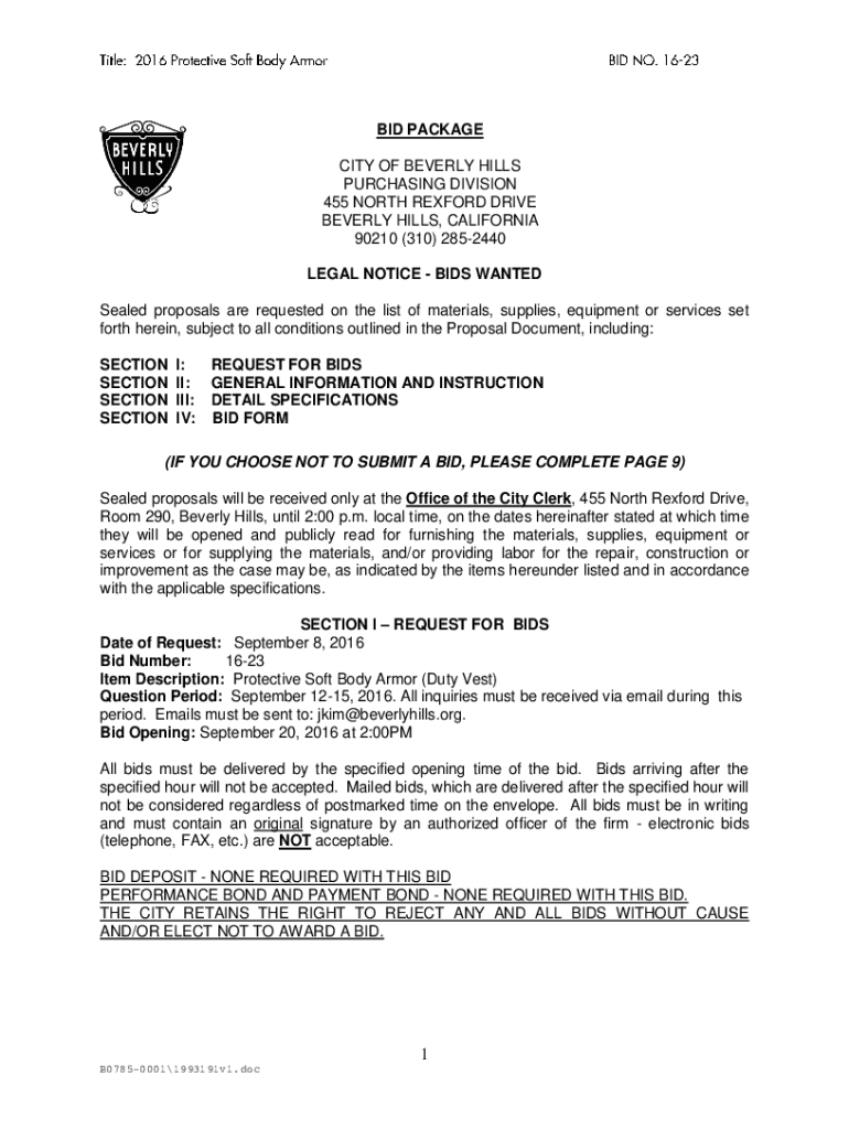 BID PACKAGE CITY OF BEVERLY HILLS PURCHASING DIVISION 455 NORTH REDFORD DRIVE BEVERLY HILLS, CALIFORNIA 90210 (310) 2852440 LEGAL NOTICE BIDS WANTED To be Sealed proposals are requested on the list