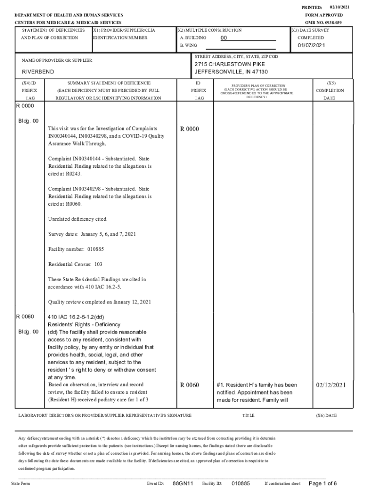 02/10/2021PRINTED: DEPARTMENT OF HEALTH AND HUMAN SERVICESFORM APPROVEDCENTERS FOR MEDICARE & MEDICAID SERVICES STATEMENT OF DEFICIENCIES(X1) PROVIDER/SUPPLIER/LIGAND PLAN OF CORRECTIONIDENTIFICATION