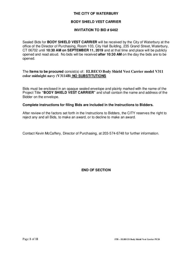 THE CITY OF WATERBURY BODY SHIELD VEST CARRIER INVITATION TO BID # 6462Sealed Bids for BODY SHIELD VEST CARRIER will be received by the City of Waterbury at the office of the Director of Purchasing,