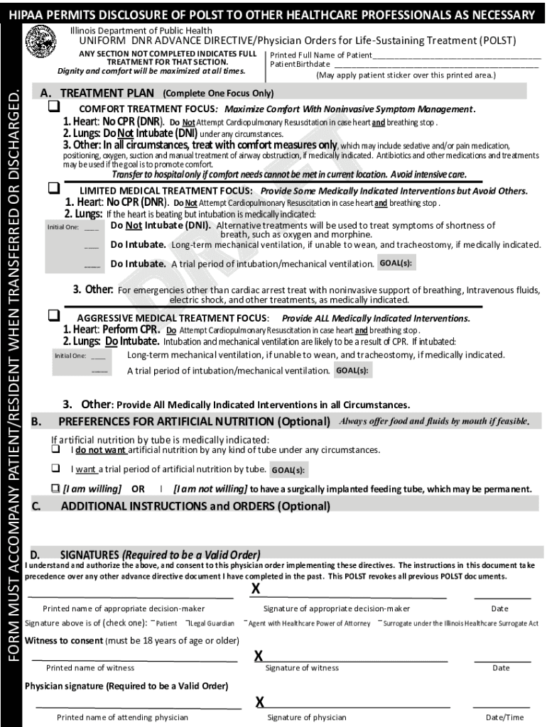 HIPAA PERMITS DISCLOSURE OF POST TO OTHER HEALTHCARE PROFESSIONALS AS NECESSARY Illinois Department of Public HealthUNIFORM DNR ADVANCE DIRECTIVE/Physician Orders for LifeSustaining Treatment (POST)FORM