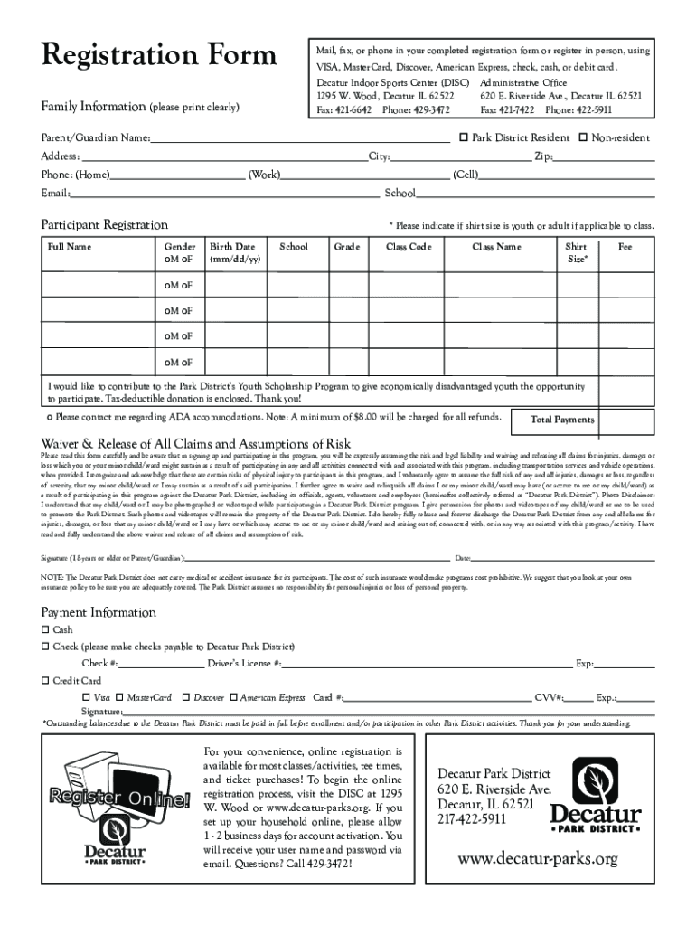 Registration Form Family Information (please print clearly)Mail, fax, or phone in your completed registration form or register in person, using VISA, MasterCard, Discover, American Express, check,