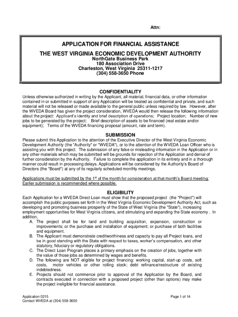 Attn:APPLICATION FOR FINANCIAL ASSISTANCE THE WEST VIRGINIA ECONOMIC DEVELOPMENT AUTHORITY Southgate Business Park 180 Association Drive Charleston, West Virginia 253111217 (304) 5583650 PhoneCONFIDENTIALITY