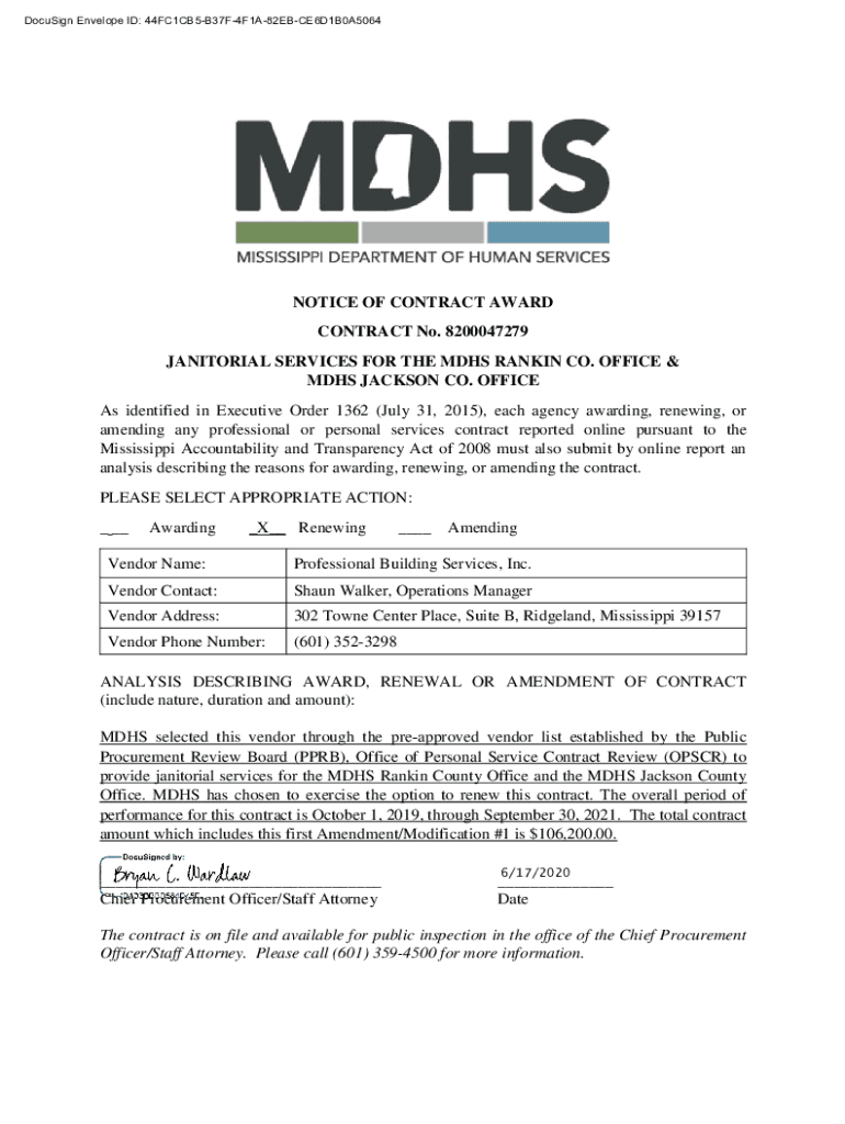 DocuSign Envelope ID: 44FC1CB5B37F4F1A82EBCE6D1B0A5064NOTICE OF CONTRACT AWARD CONTRACT No. 8200047279 JANITORIAL SERVICES FOR THE MDS RANKIN CO. OFFICE & MDS JACKSON CO. OFFICE As identified in Executive