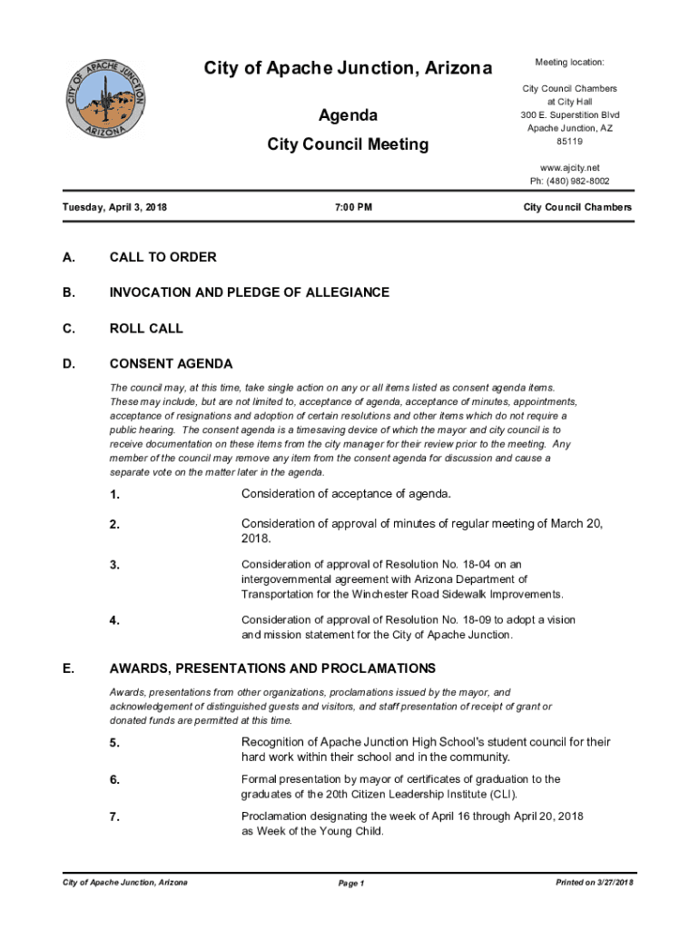 City of Apache Junction, Arizona Agenda City Council MeetingMeeting location: City Council Chambers at City Hall 300 E. Superstition Blvd Apache Junction, AZ 85119 www.ajcity.net pH: (480) 9828002Tuesday,
