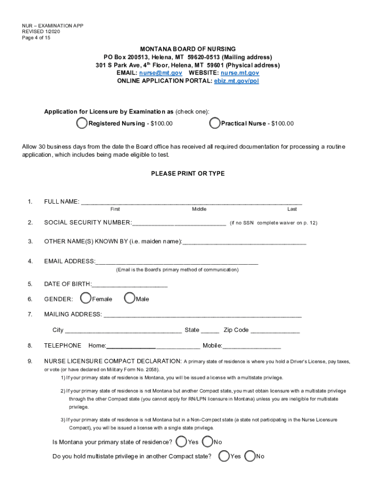 OUR EXAMINATION APP REVISED 1/2020-Page 1 of 15MONTANA BOARD OF NURSING PO Box 200513, Helena, MT 596200513 (Mailing address) 301 S Park Ave, 4th Floor, Helena, MT 59601 (Physical address) EMAIL: