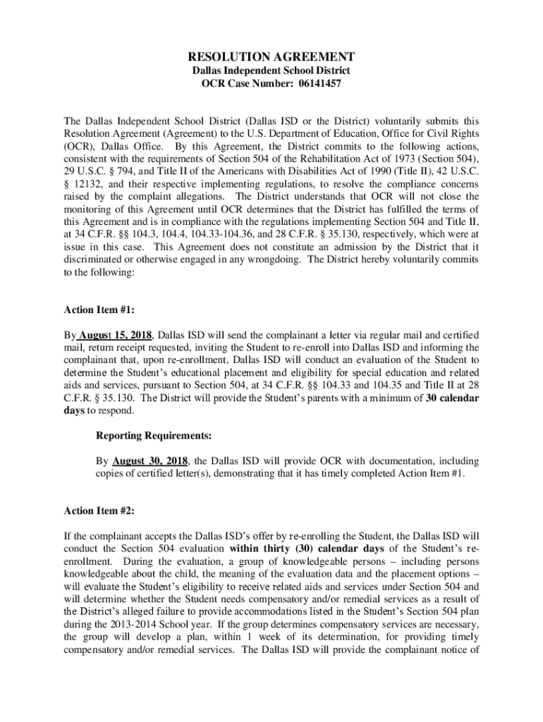 RESOLUTION AGREEMENT Dallas Independent School District OCR Case Number: 06141457The Dallas Independent School District (Dallas ISD or the District) voluntarily submits this Resolution Agreement (Agreement)