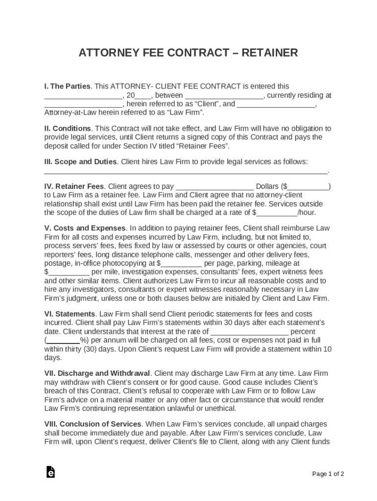 The Attorney Fee Contract – Retainer is a legal document used by clients and law firms to establish an agreement regarding legal services and retainer fees.