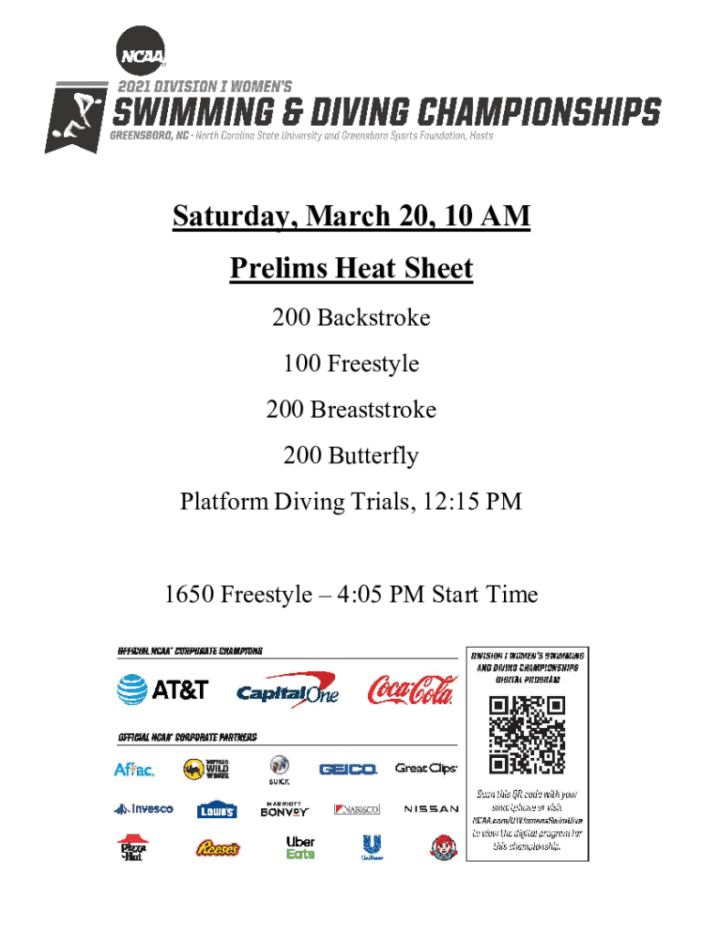 Saturday, March 20, 10 AM Prelims Heat Sheet 200 Backstroke 100 Freestyle 200 Breaststroke 200 Butterfly Platform Diving Trials, 12:15 PM 1650 Freestyle 4:05 PM Start Time NCAA Division I Championship