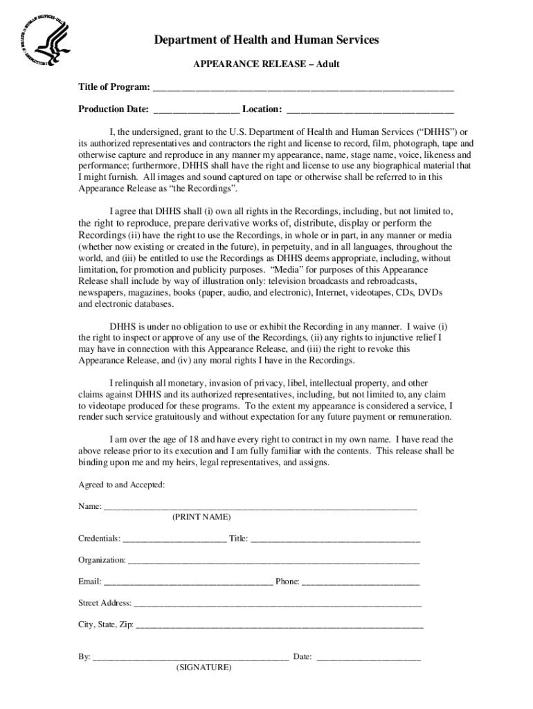 Department of Health and Human Services APPEARANCE RELEASE Adult Title of Program: Production Date: Location: I, the undersigned, grant to the U.S. Department of Health and Human Services (HHS) or