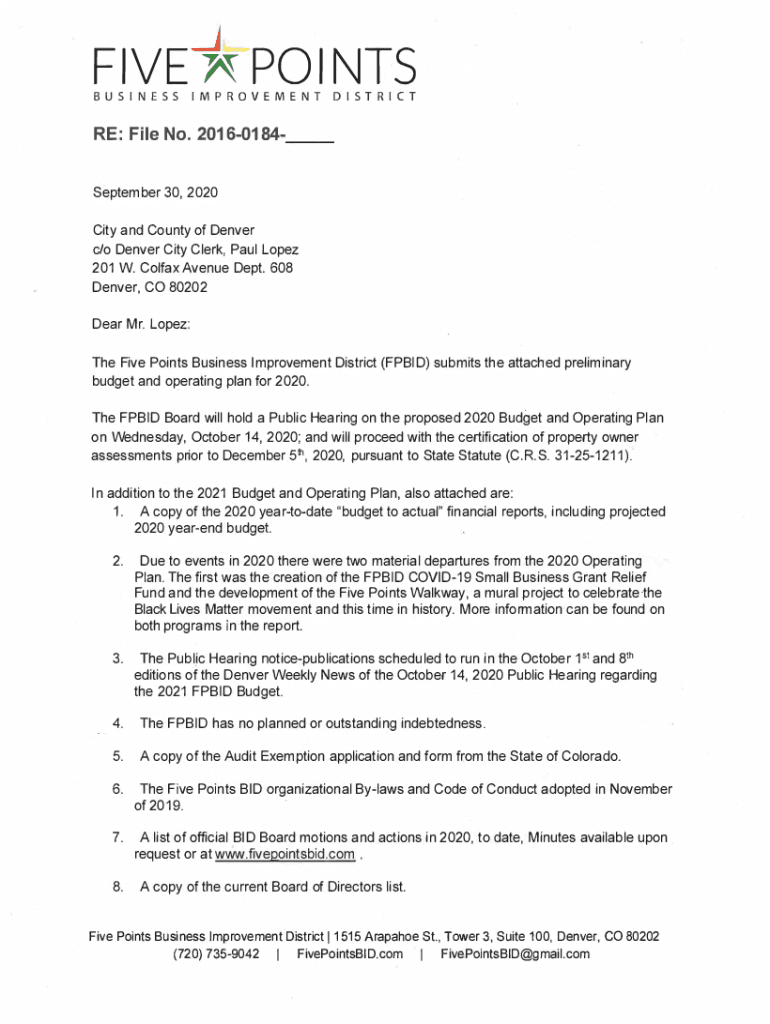 FIVE POINTSBUSINESS IMPROVEMENT DISTRICT RE: File No. 20160184September 30, 2020 City and County of Denver c/o Denver City Clerk, Paul Lopez 201 W. Colfax Avenue Dept. 608 Denver, CO 80202 Dear Mr.