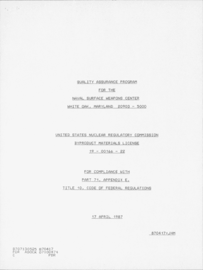 . ... ..1! .:i.1iiiil, i!QUALITY ASSURANCE PROGRAMMER THEjiNAVAL SURFACE WEAPONS CENTER WHITE OAK, MARYLAND20903 5000I1. UNITED STATES NUCLEAR REGULATORY COMMISSIONlBYPRODUCT MATERIALS LICENSE!19