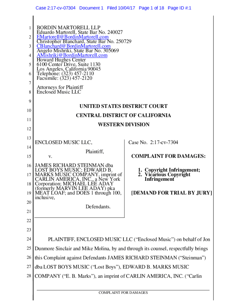 Case 2:17cv07304 Document 1 Filed 10/04/17-Page 1 of 18-Page ID #:11 2 3 4 5 6BORDIN MARMOREAL LLP Eduardo Marmoreal, State Bar No. 240027 EMartorell@BordinMartorell.com Christopher Blanchard, State