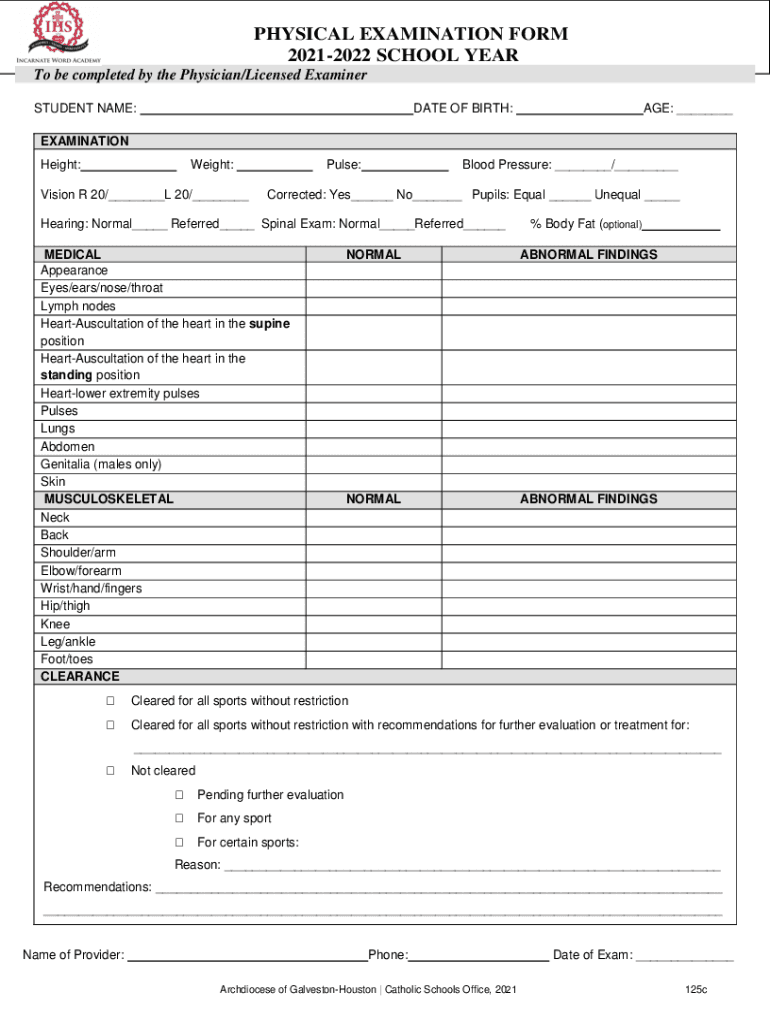 PHYSICAL EXAMINATION FORM 20212022 SCHOOL YEAR To be completed by the Physician/Licensed Examiner STUDENT NAME:DATE OF BIRTH:AGE: EXAMINATION Height:Weight:Vision R 20/ L 20/ Pulse:Blood Pressure: