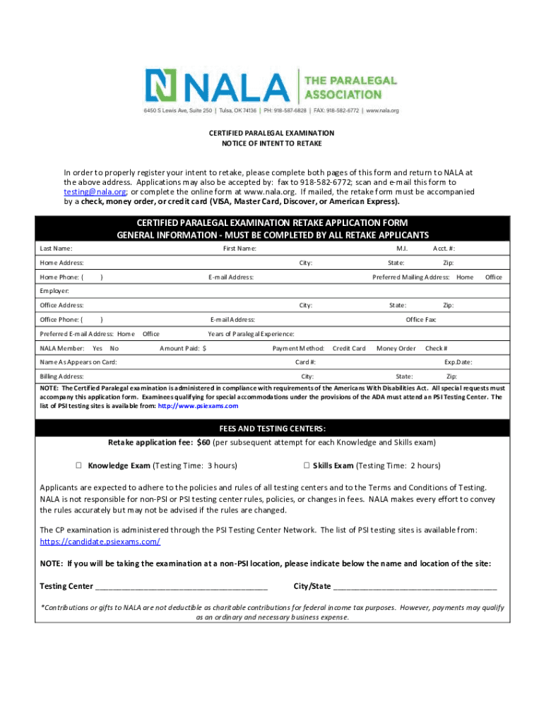 CERTIFIED PARALEGAL EXAMINATION NOTICE OF INTENT TO Retaken order to properly register your intent to retake, please complete both pages of this form and return to NASA at the above address. Applications