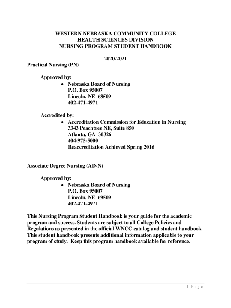 WESTERN NEBRASKA COMMUNITY COLLEGE HEALTH SCIENCES DIVISION NURSING PROGRAM STUDENT HANDBOOK 20202021 Practical Nursing (IN) Approved by: Nebraska Board of Nursing P.O. Box 95007 Lincoln, NE 68509