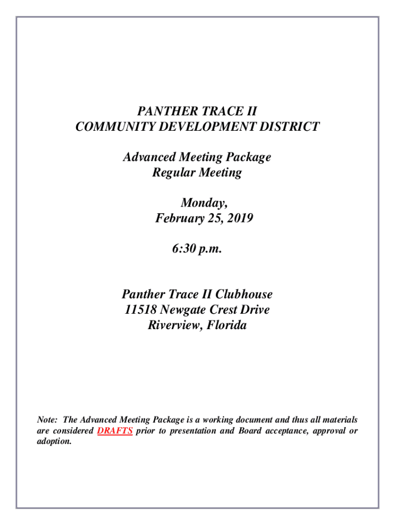 PANTHER TRACE II COMMUNITY DEVELOPMENT DISTRICT Advanced Meeting Package Regular Meeting Monday, February 25, 2019 6:30 p.m. Panther Trace II Clubhouse 11518 Negate Crest Drive Riverview, Fluoridate:
