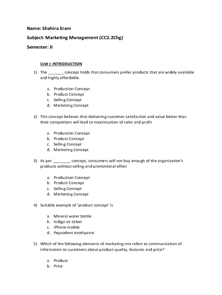 Name: Shakira Era Subject: Marketing Management (CC2.2Chg) Semester: Unit I: INTRODUCTION 1) The concept holds that consumers prefer products that are widely available and highly affordable. a. b.